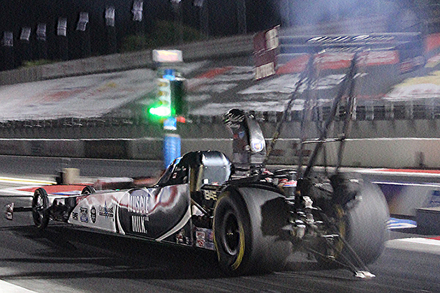 In round one, Madison raced first-time opponent Trever Larkin in the Redline-sponsored entry. At the hit, the Muscle Milk machine was out first with a .087 to Larkin's .108. As the cars charged to the finish line, it was all Madison taking the win with a 5.34 at 274 MPH over Larkin's 5.57 at 257 MPH. "Trever Larkin had a couple of holes out so I never saw him" Madison said.
